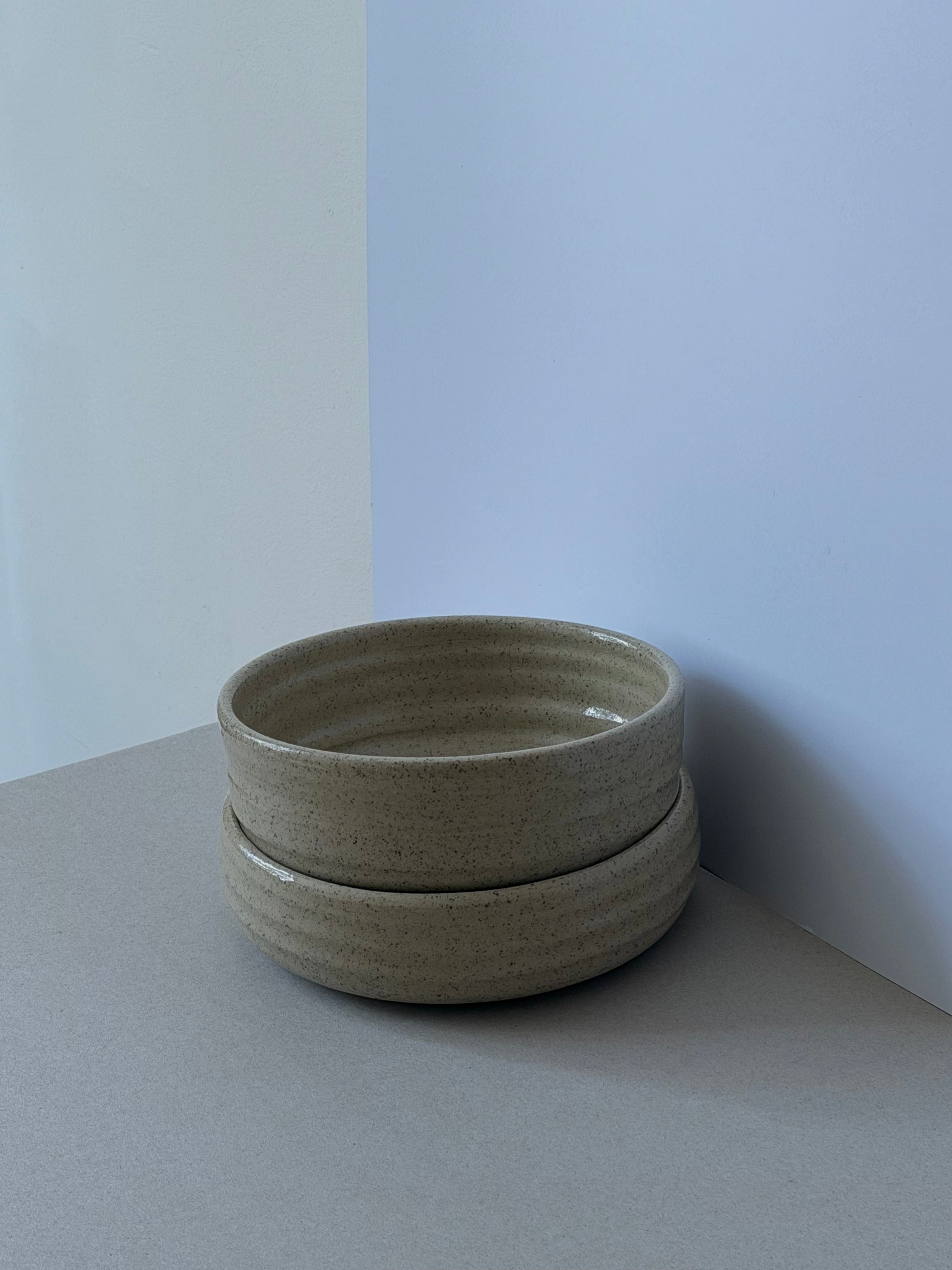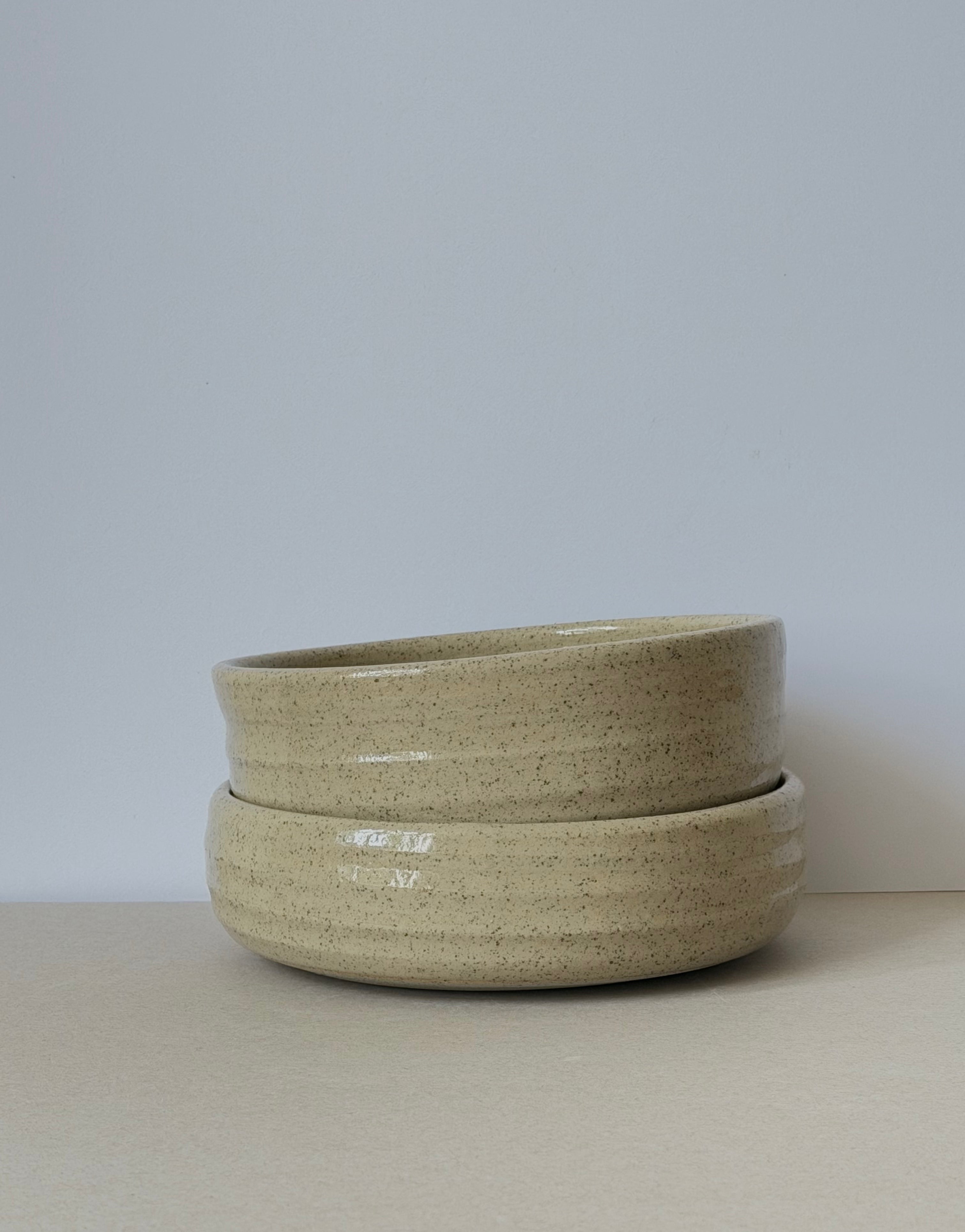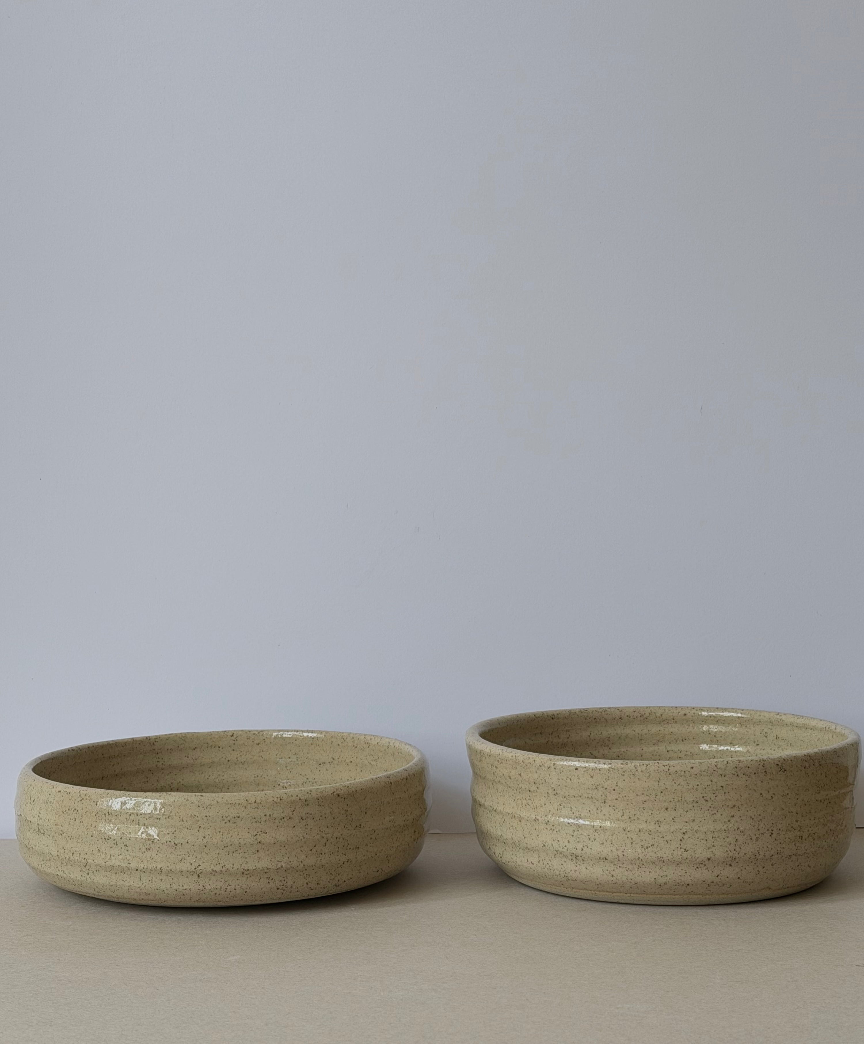This pair of stoneware bowls is made for sharing - perfect for serving generous, share-plate style dishes. Each bowl shows the subtle rhythm of the throwing process, with visible throw-lines that trace the movement of clay on the wheel.