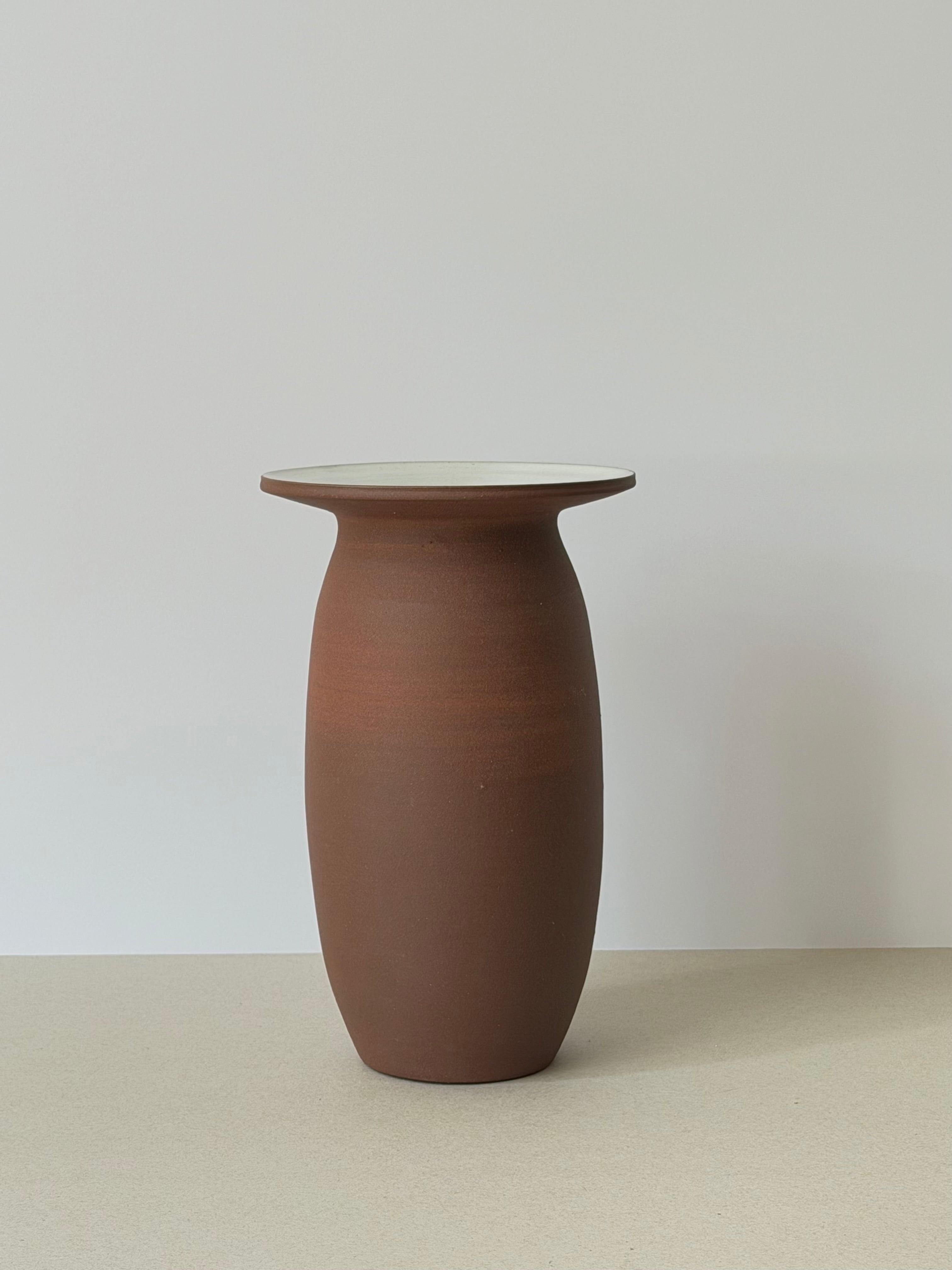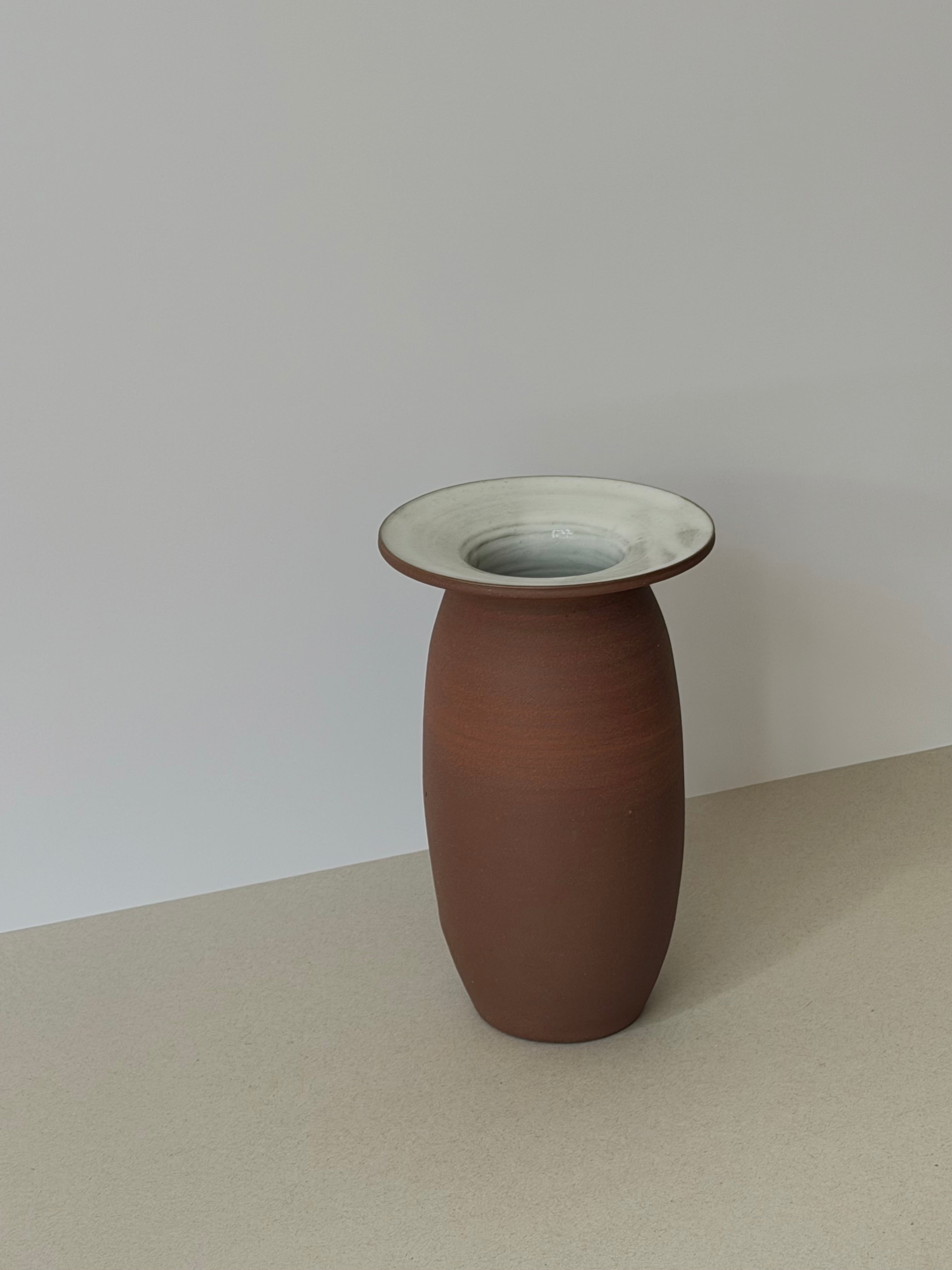 A study in restraint and refinement, this hand-thrown vessel reflects a harmony between form and glaze that feels both modern and timeless. Crafted from iron-rich clay. Its slender body rises into a broad, flared rim washed in a semi translucent glaze - a gentle veil that settles like mist. The meeting of raw clay and soft translucency speaks to Lucie Rie’s belief that beauty lies in balance: between tension and release, simplicity and depth. Each line feels considered, every surface intentional.