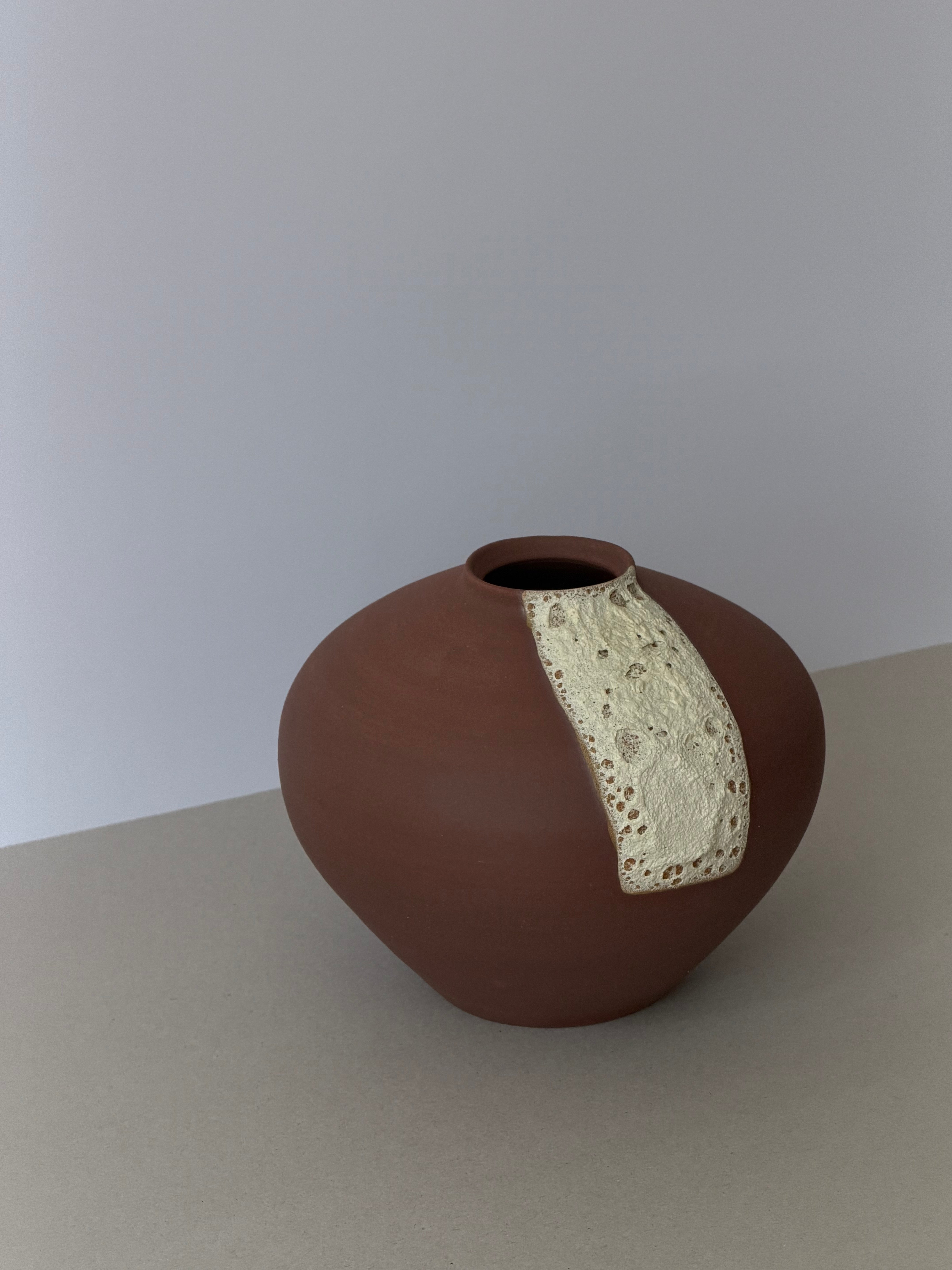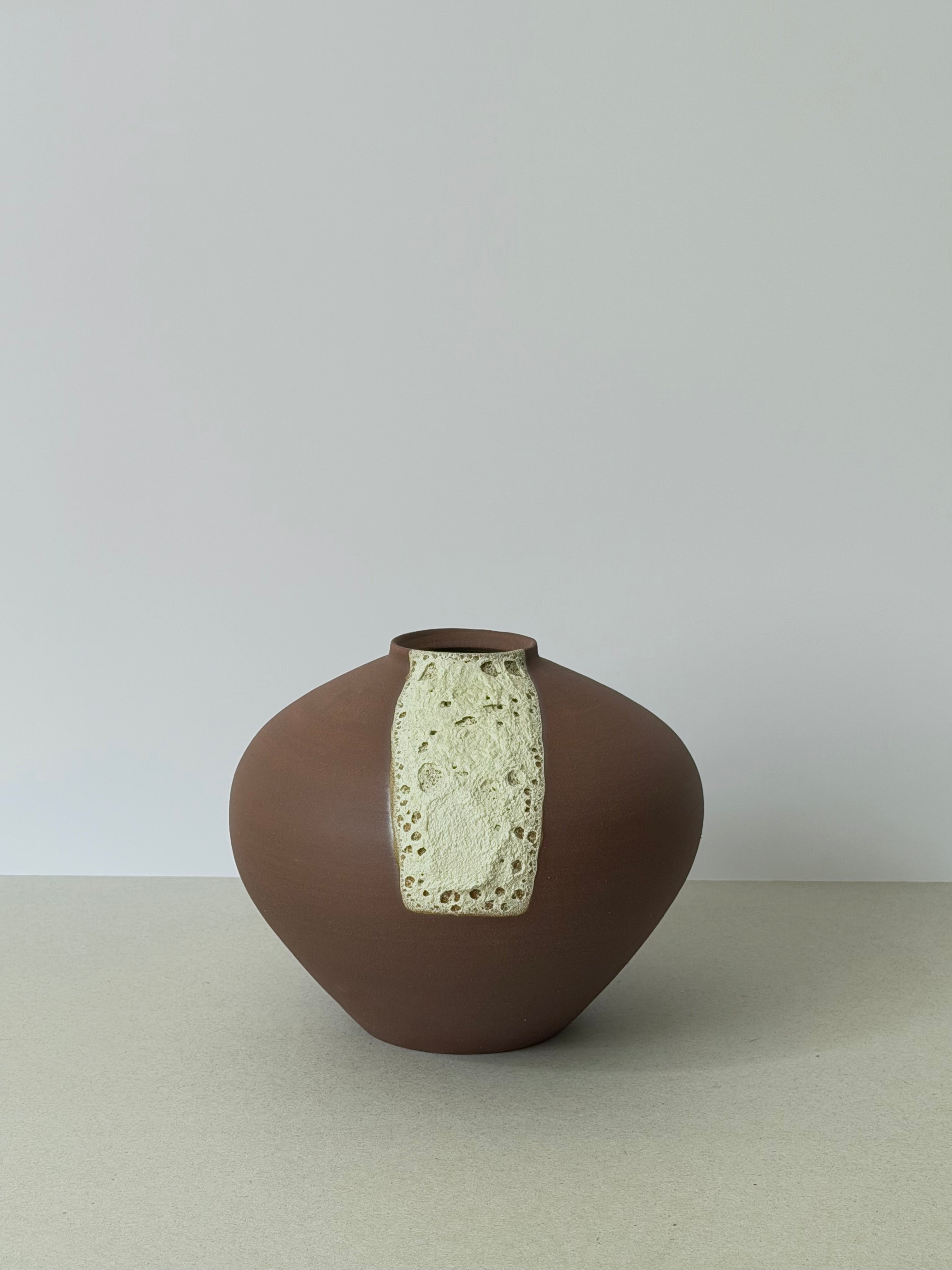 Sculptural and grounded, this vessel embodies the meeting of earth and fire. Hand-thrown from richly toned wild terracotta clay, its broad form is interrupted by a striking panel of volcanic glaze. The contrast between the raw matte body and the cratered, mineral glaze evokes the drama of geological transformation, where pressure and heat give rise to new terrain.