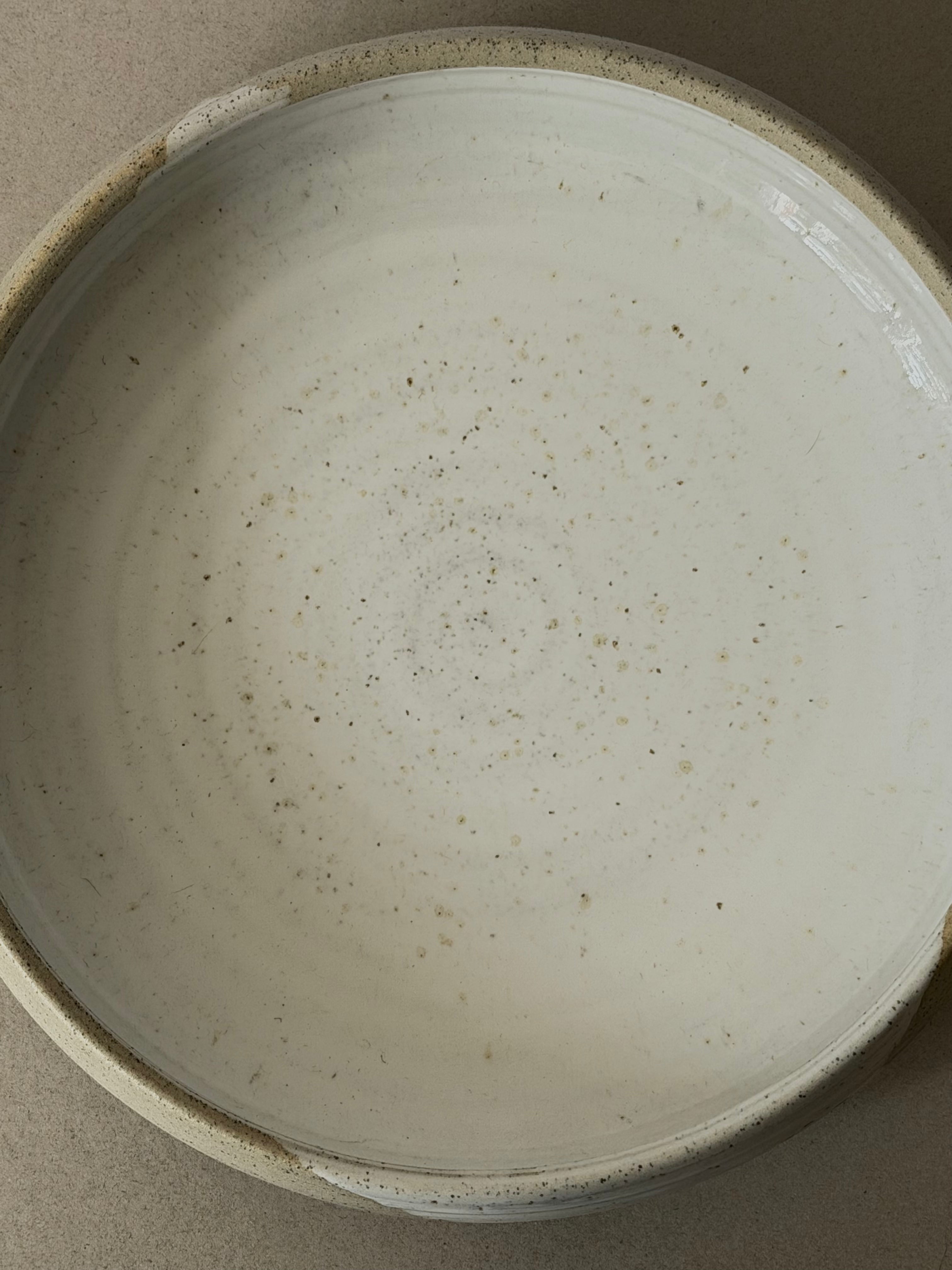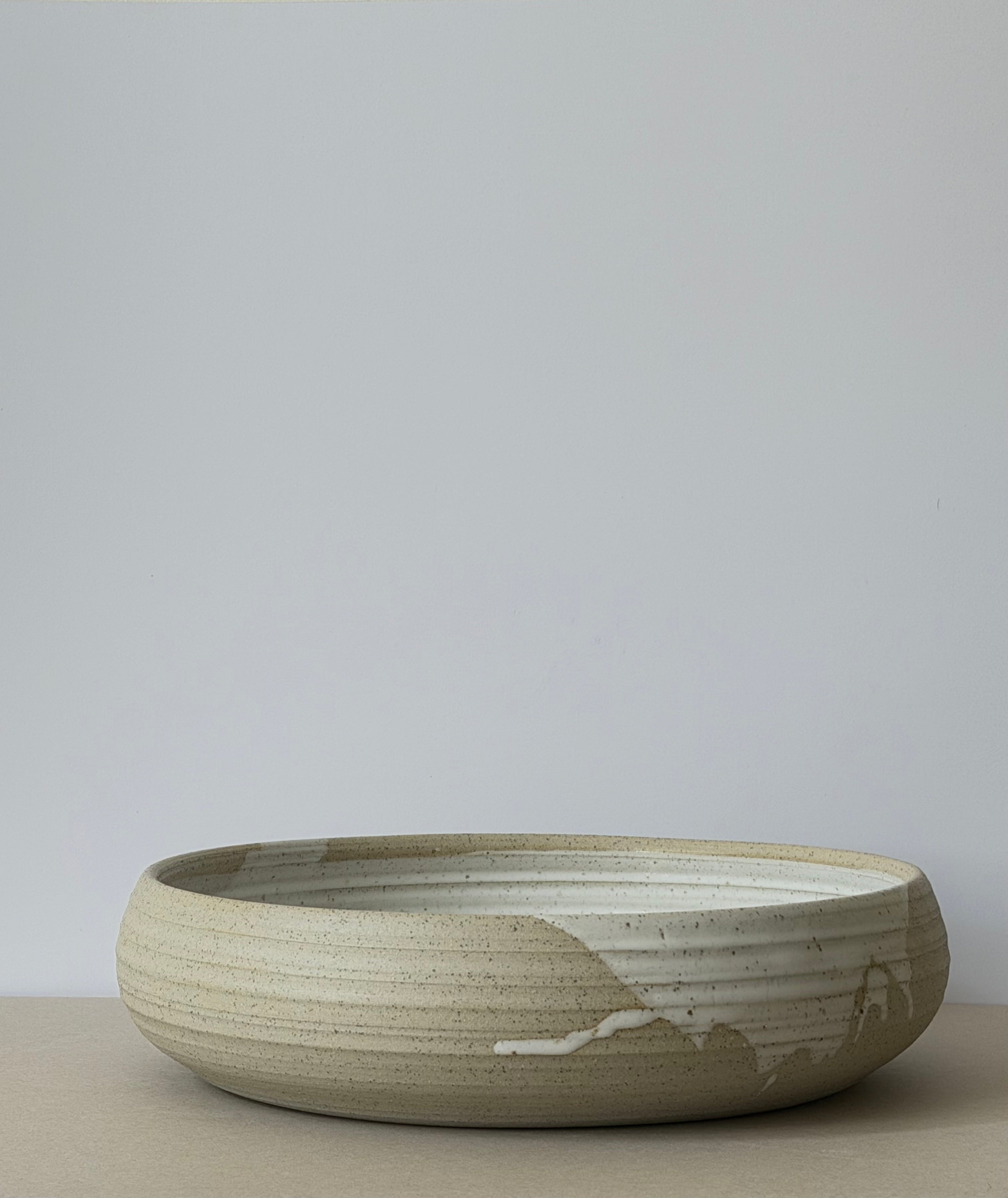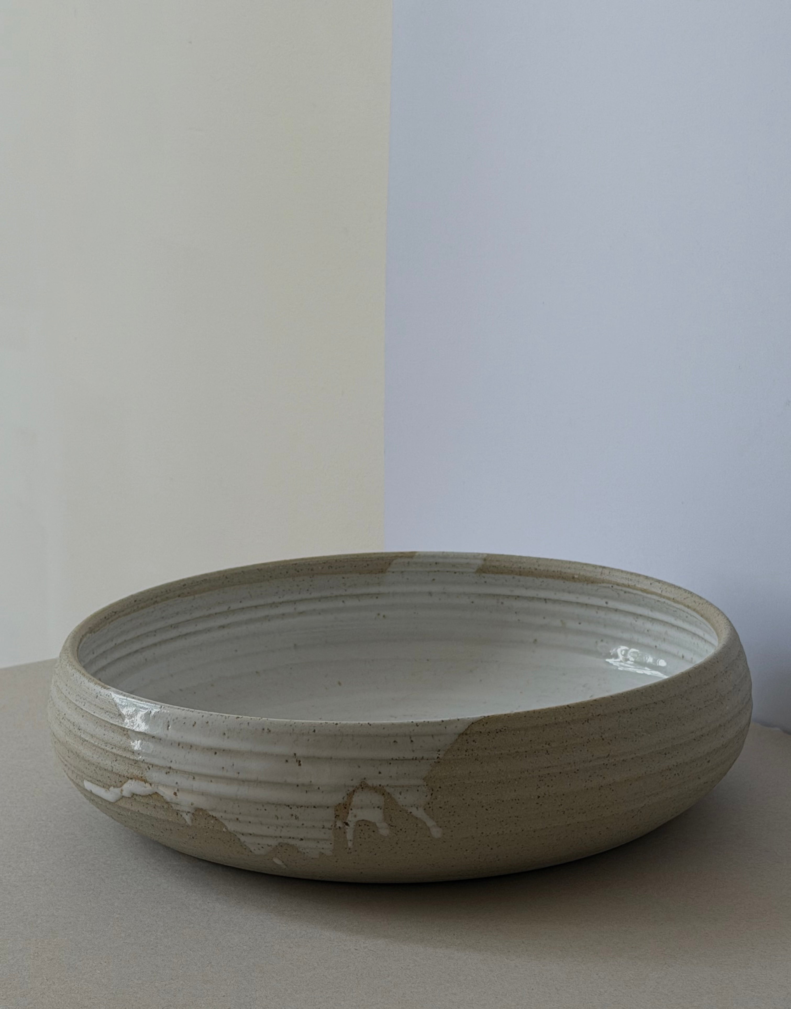 Its wide, open form and smooth glazed interior make it ideal for share food or a big fruit bowl. The clay’s natural warmth is left visible on the exterior, where the glaze breaks and softens, showing the quiet beauty of its making process.