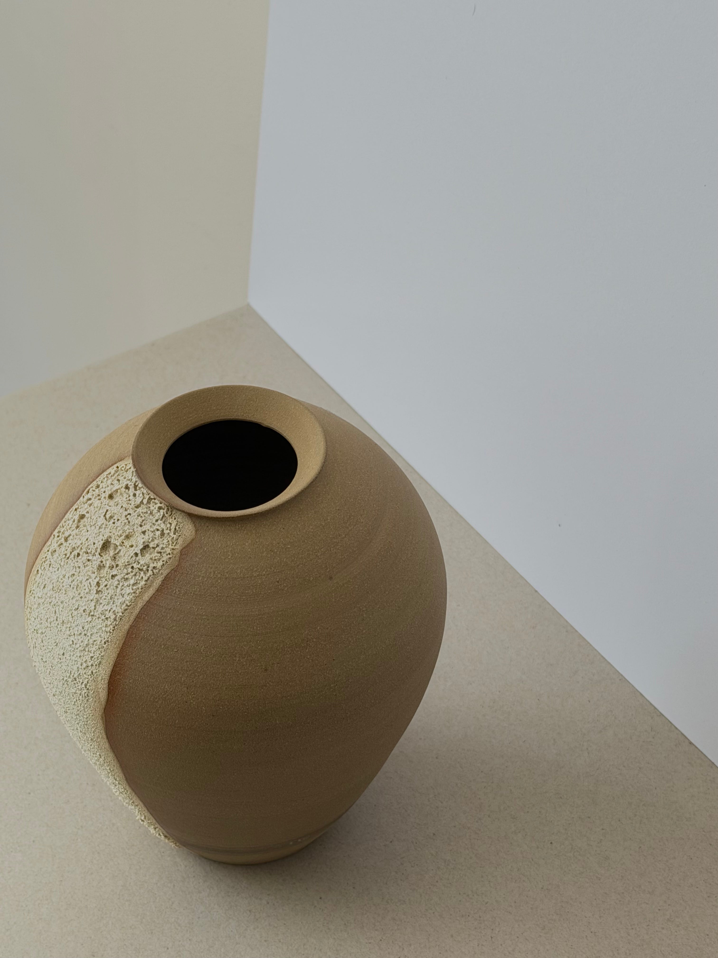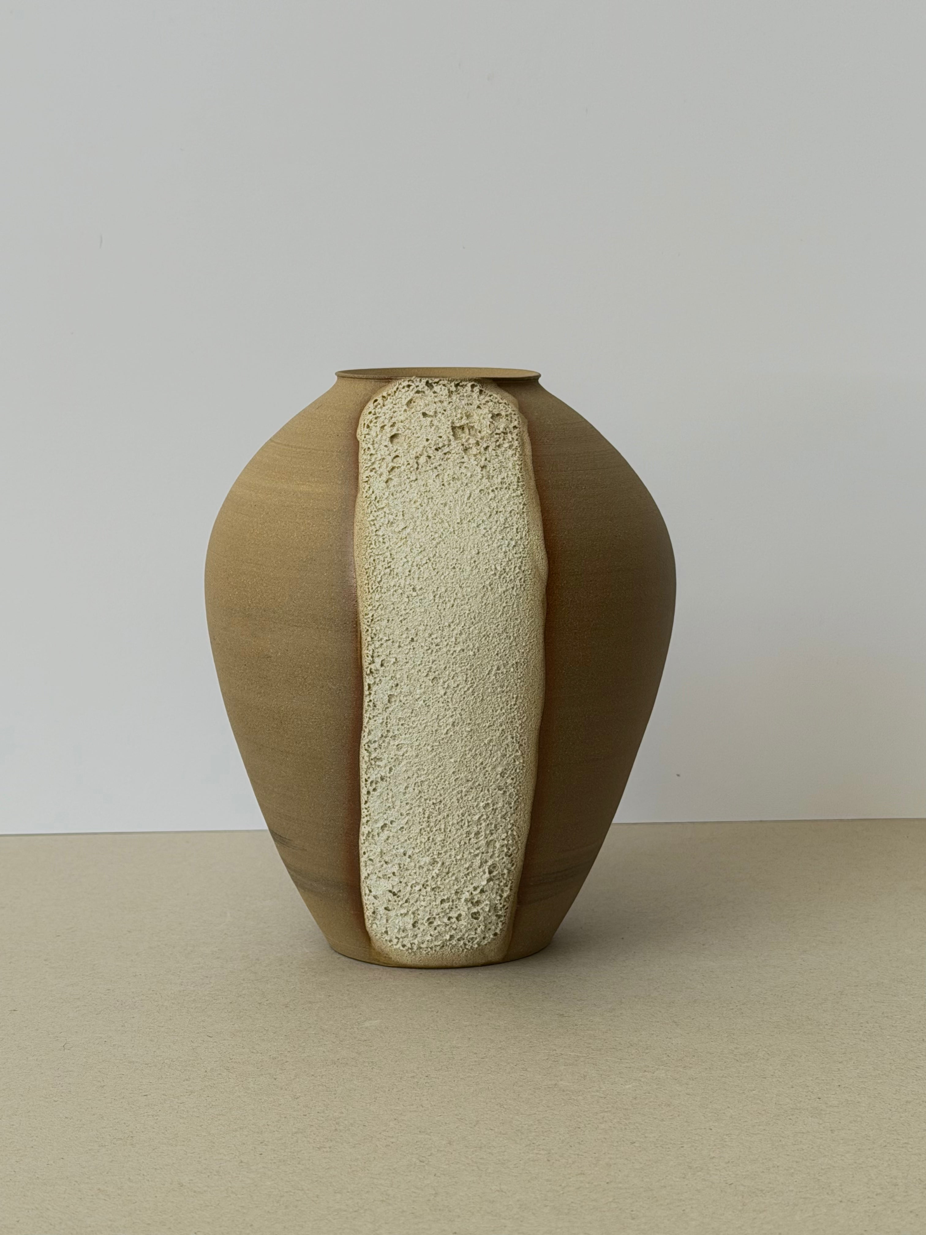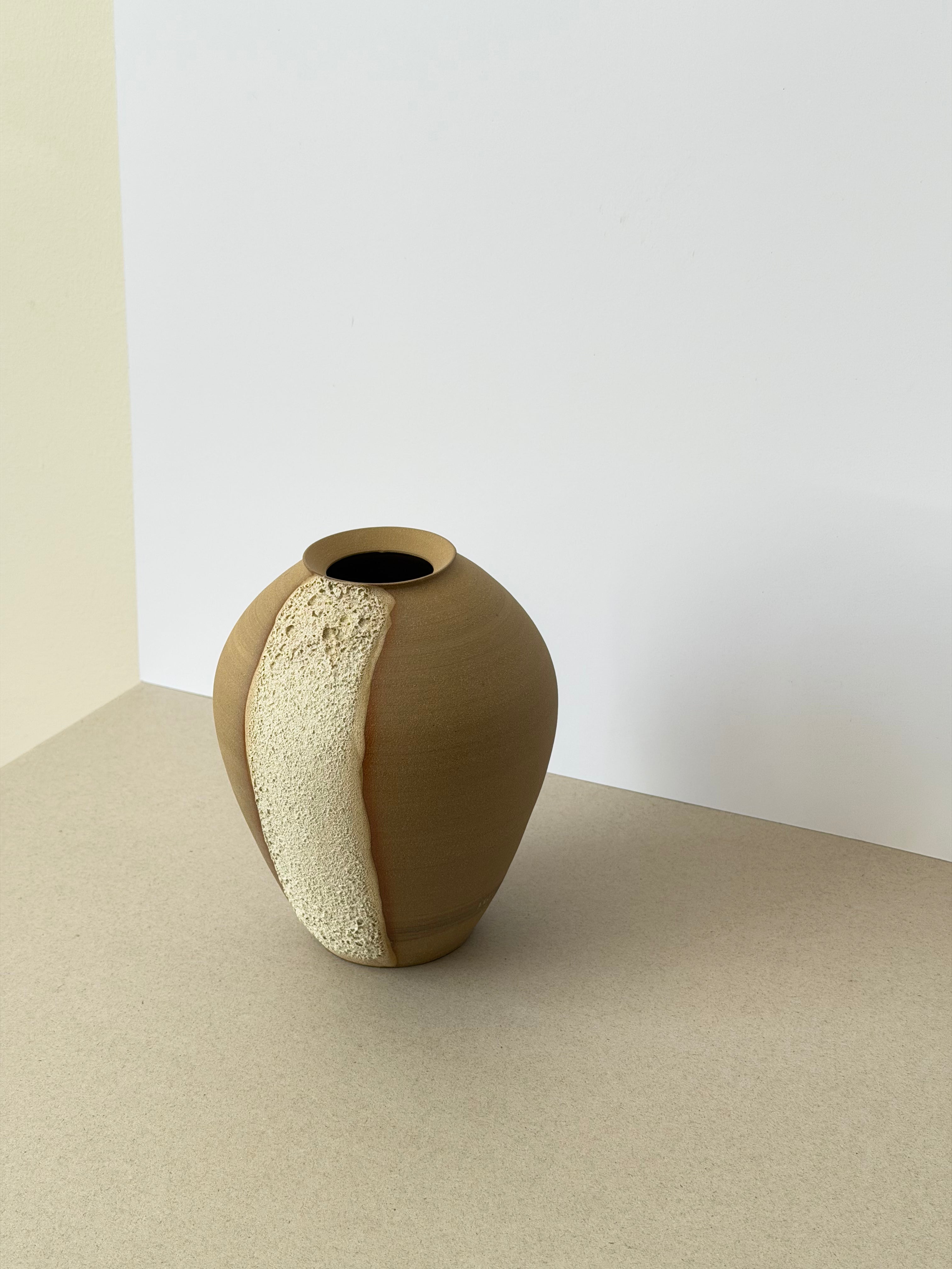 A hand-thrown stoneware vessel defined by its bold contrast of texture - a smooth, rounded form interrupted by a vertical ridge of coarse clay. The composition balances control and spontaneity, surface and rawness.