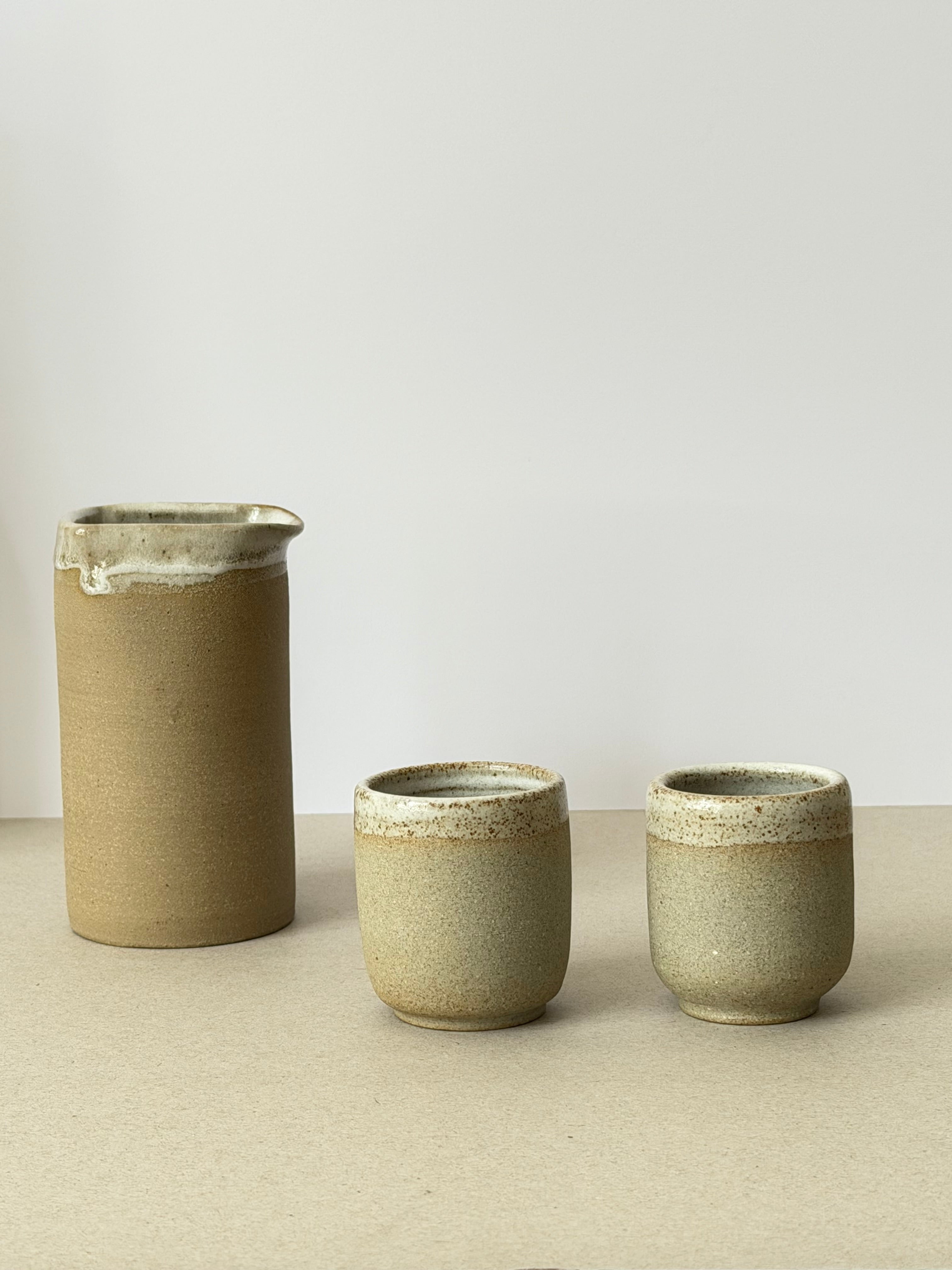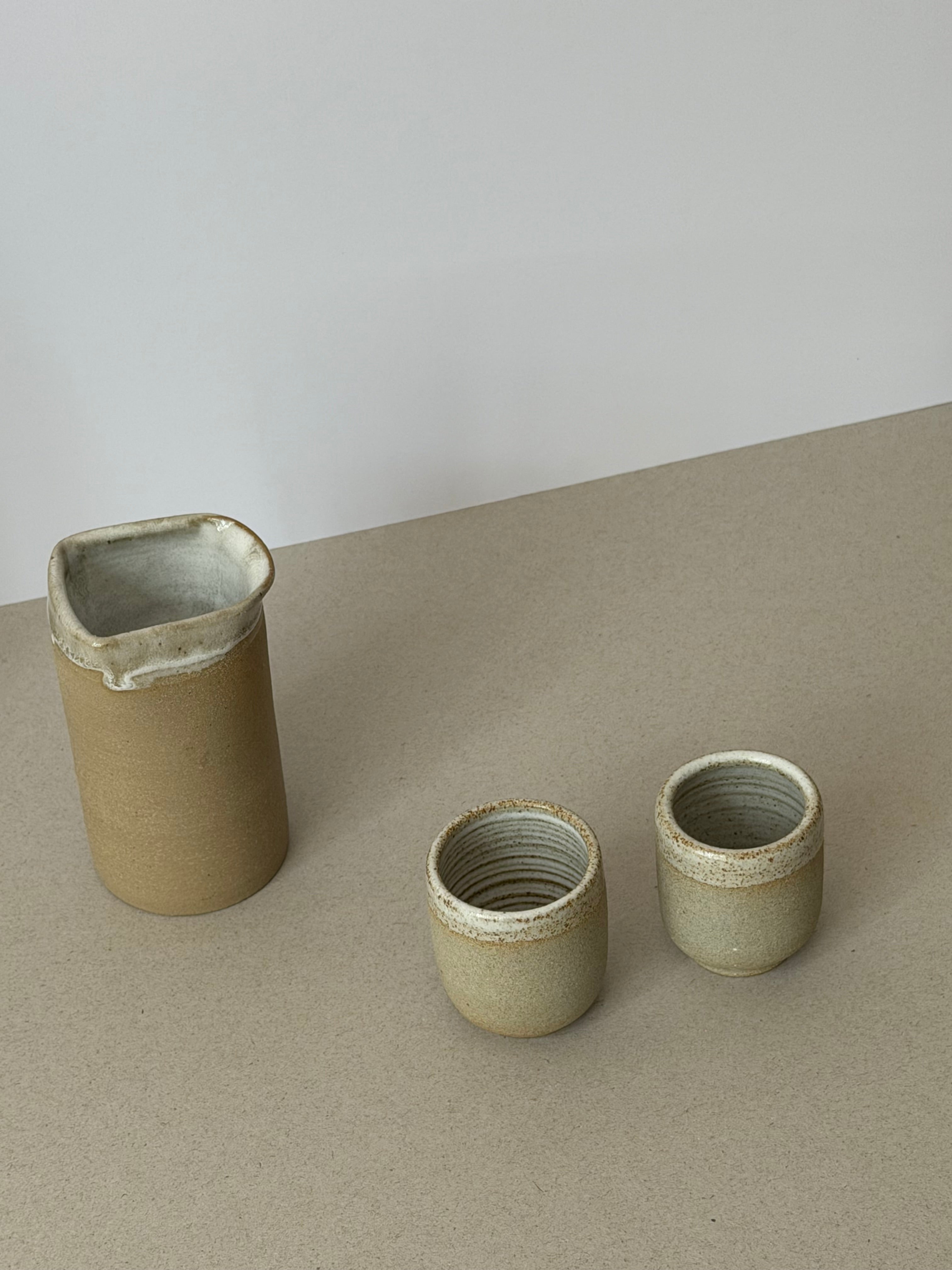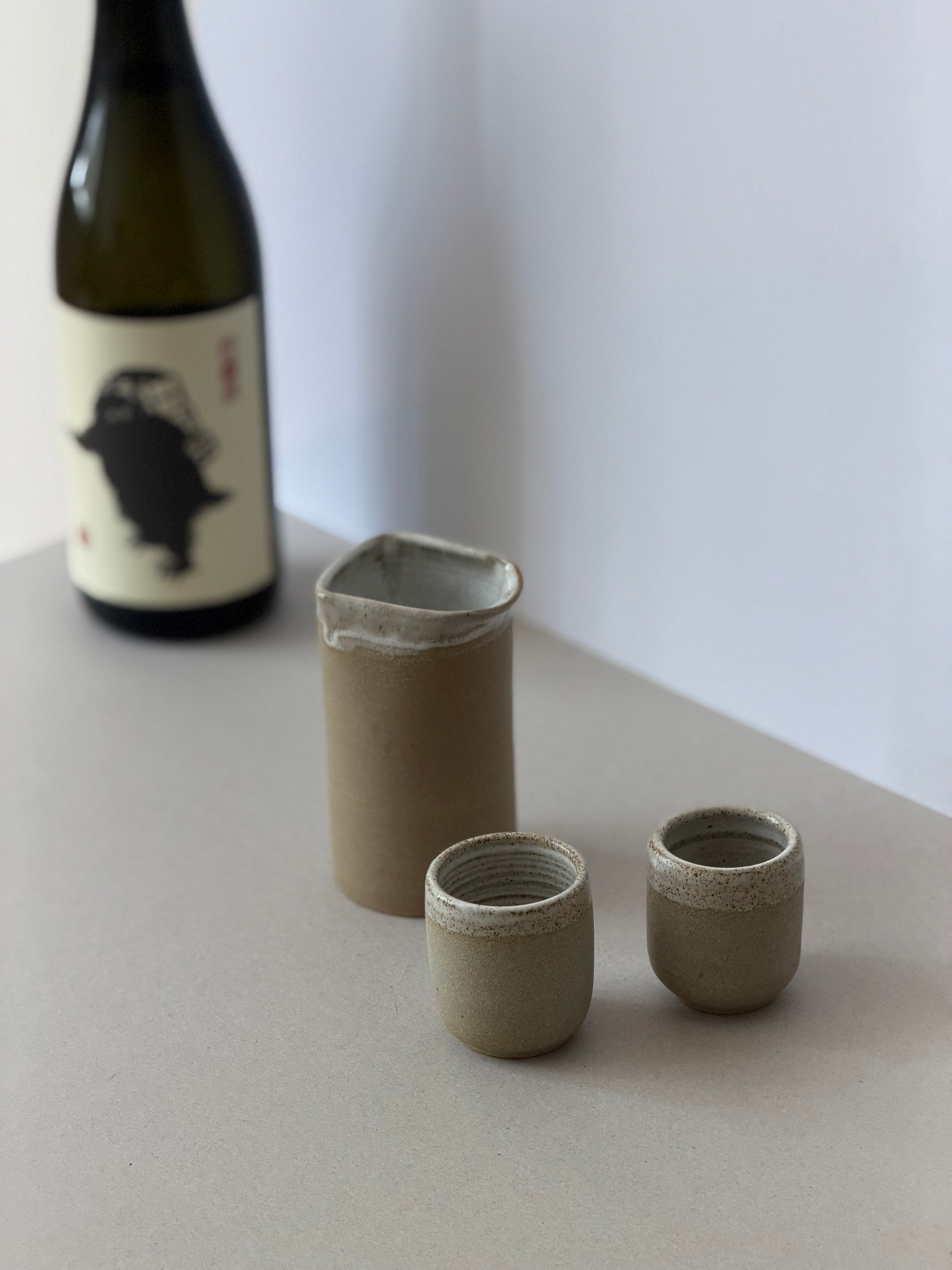 This hand-thrown stoneware sake set includes one carafe and two cups - made for slow, shared moments. Each piece shows subtle variations from the throwing process, with soft glaze transitions that highlight the natural warmth of the clay.