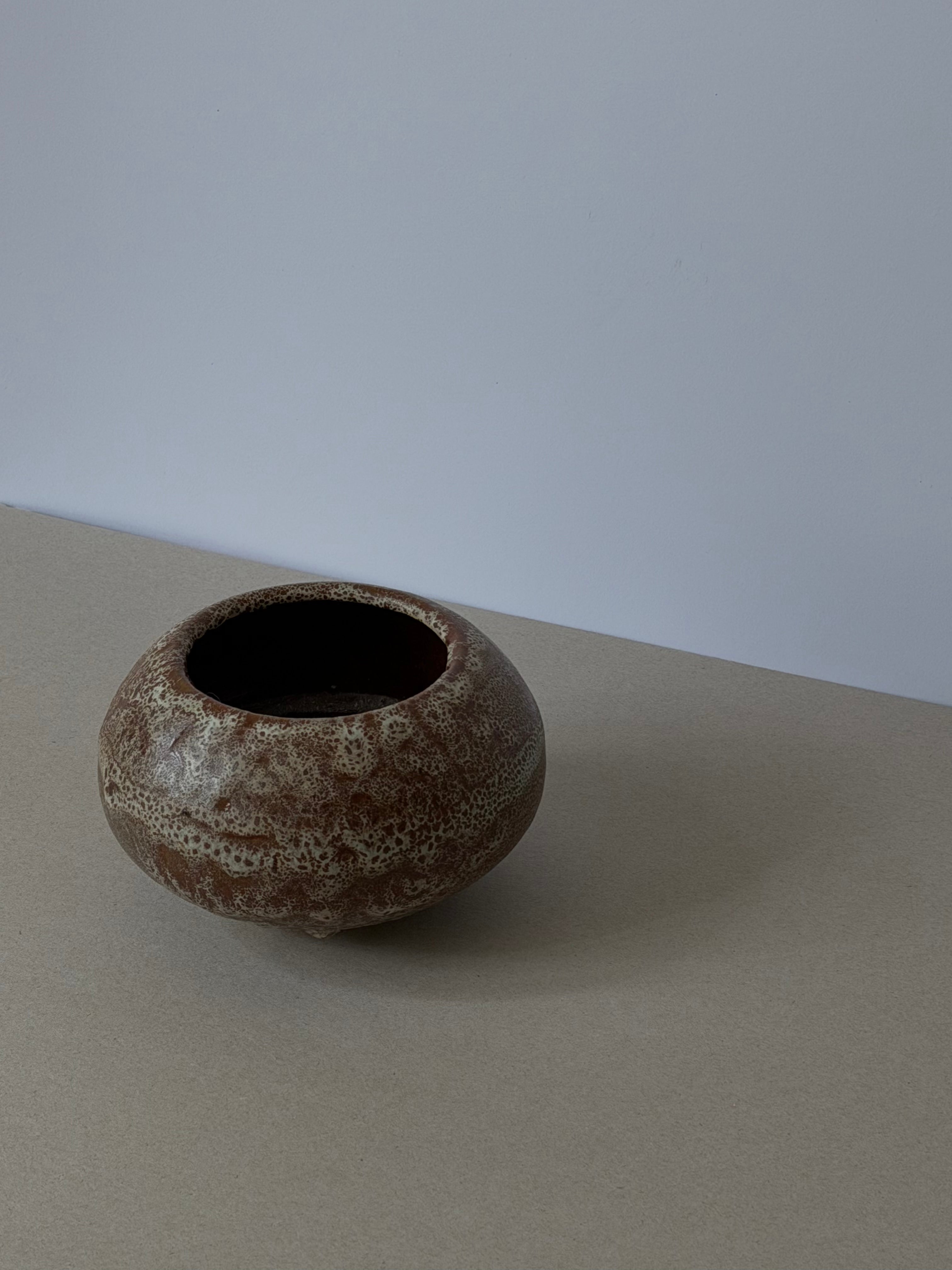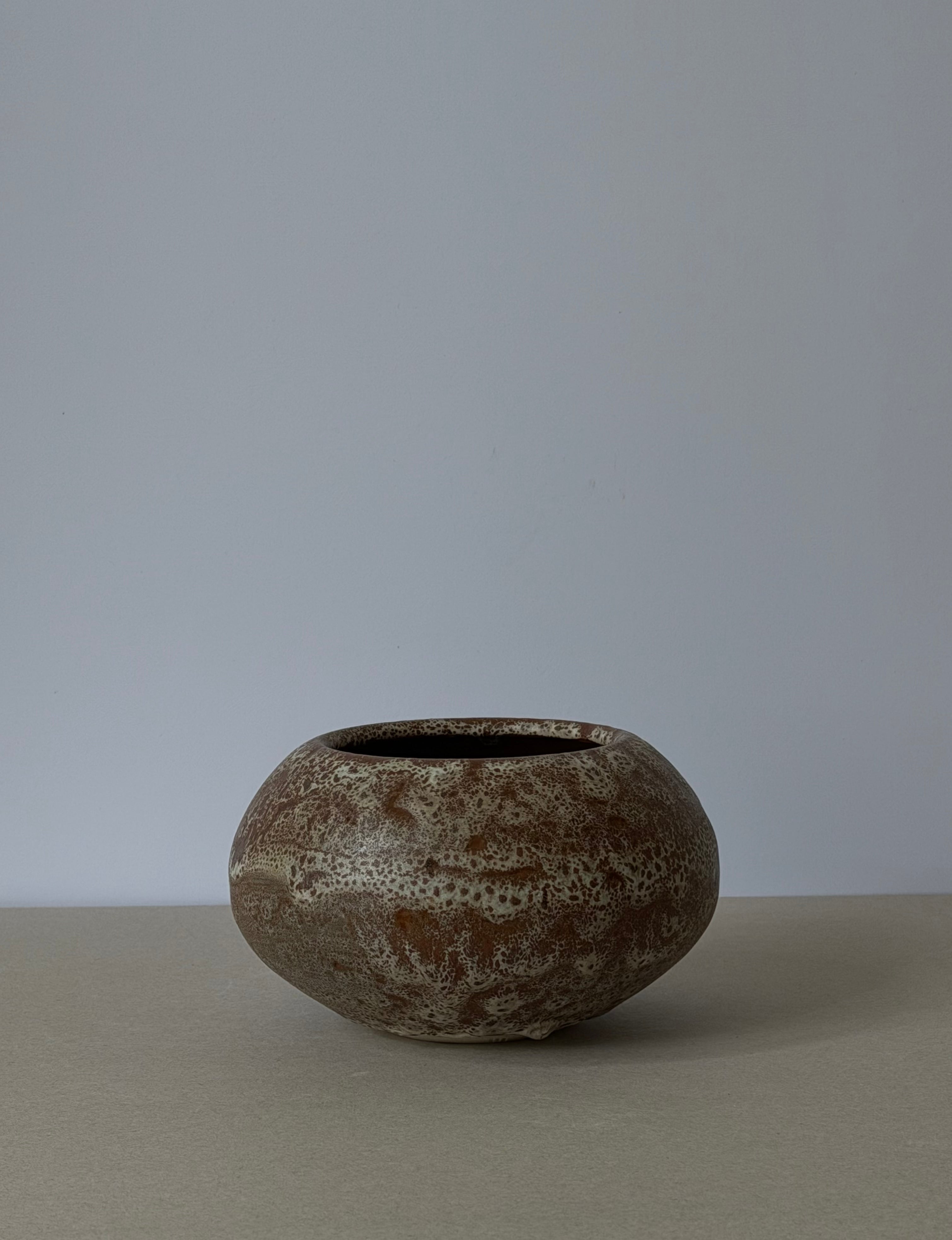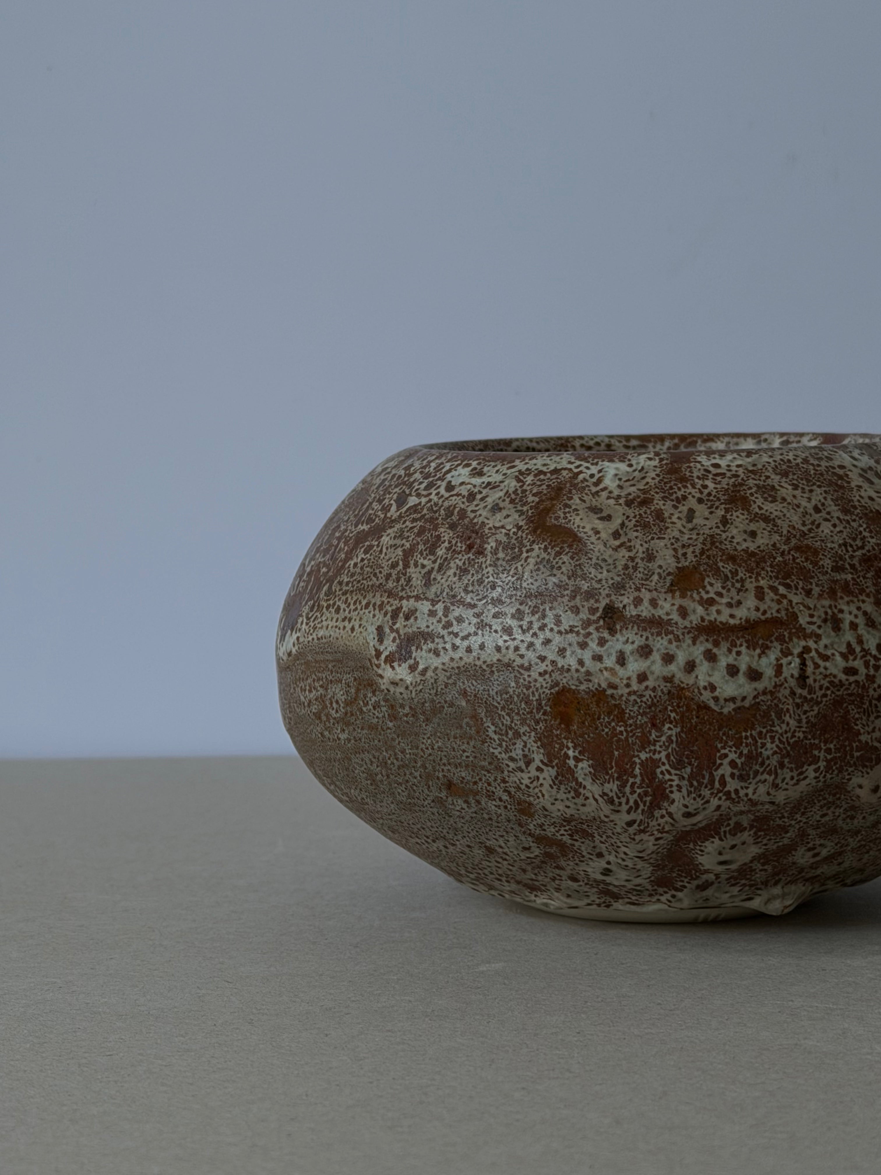 Draws inspiration from the unpredictable beauty of glaze chemistry - the way flux, mineral, and fire combine to produce organic patterning beyond control. The vessel reflects a fascination with material volatility: how transformation leaves its trace in texture. Its surface resembles cooled magma or oxidized metal, suggesting that even stillness can hold the energy.